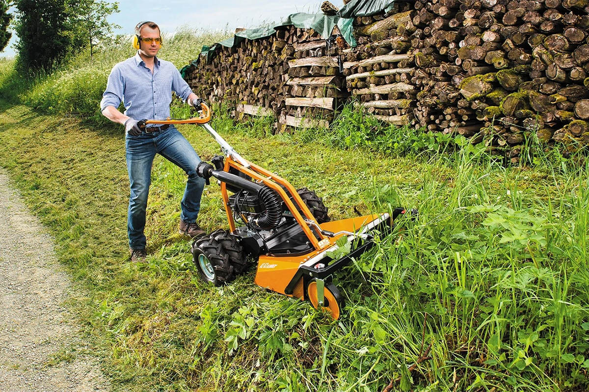The 2-stroke engine’s high torque provides full power in high, wet grass while a third crankshaft bearing and friction discs on the wing blade protect the engine in the event of striking an obstacle. Large inflatable tyres with field studs offer ideal propulsion at speeds up to 4.0 km/h.