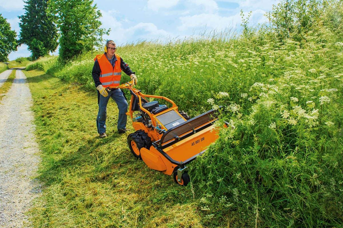The AS 901 SM is conveniently operated via four levers. Individual wheels are controlled via a patented steering and brake clutch system by which light pressure on the wheel’s respective operating lever opens the limited slip differential; full pressure activates the brake on that wheel. Furthermore, the limited slip differential is permanently locked when in drive and the automatic parking brake engages as soon as the drive lever is released. This added safety feature stops the flail mower whether on a slope or level ground. Teflon-coated stainless steel Bowden cables ensure minimal expenditure of force. The result is safe, simple, and convenient operation.
